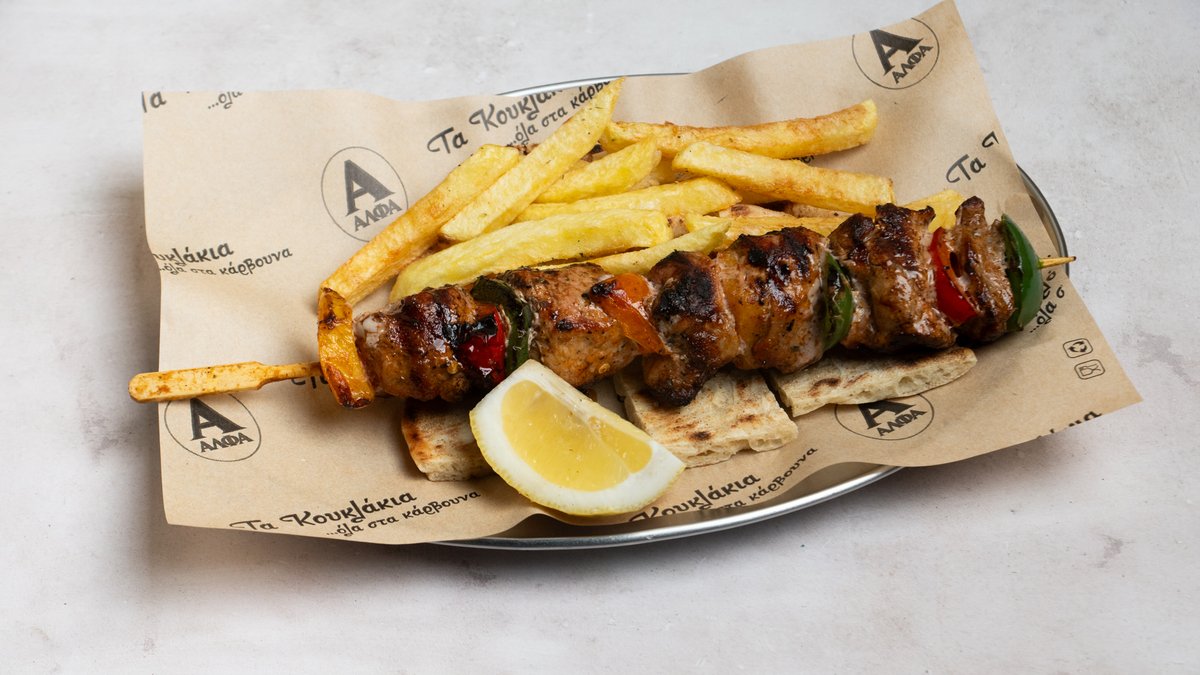 Συνοδεύεται από πατάτες τηγανητές, κρεμμύδι, ντομάτα, 2 πίτες και σως της επιλογής σου