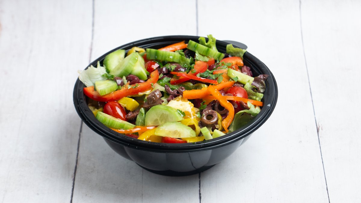 Με πράσινη σαλάτα, χρωματιστές πιπεριές, κόκκινα φασόλια, πορτοκάλι σε ροδέλες, μαϊντανό, ντοματίνια, αγγούρι τουρσί, ελιές, λάδι, χυμό λεμόνι, μουστάρδα, αλάτι