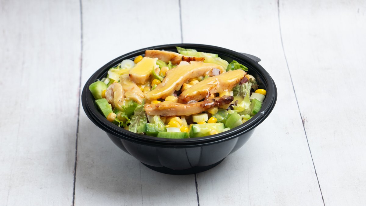 Με πράσινη σαλάτα, καλαμπόκι, ελιές ροδέλες, κρουτόν, αγγουράκι ψιλοκομμένο, κοτόπουλο, φρέσκο κρεμμυδάκι, μέλι, μουστάρδα, λάδι