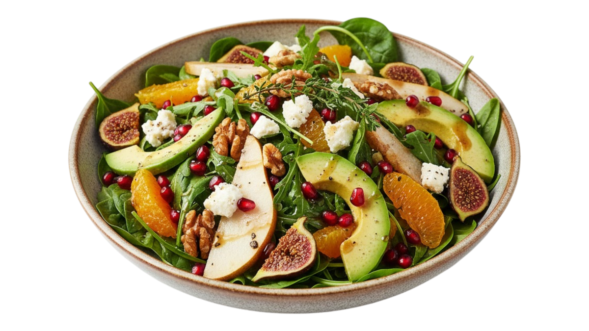 Με ρόκα, σπανάκι, αχλάδι, ρόδι, καρύδια, αποξηραμένα σύκα, παστελάκι, κατσικίσιο τυρί, πορτοκάλι, αβοκάντο, λάδι, βαλσάμικο, μέλι, μουστάρδα.