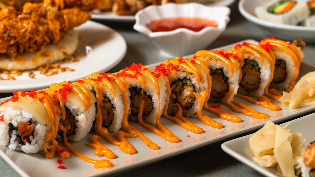 8 κομμάτια. Ρολό με τηγανητή γαρίδα και Philadelphia. Χειροποίητα. Συνοδεύεται από σόγια σάλτσα και ginger