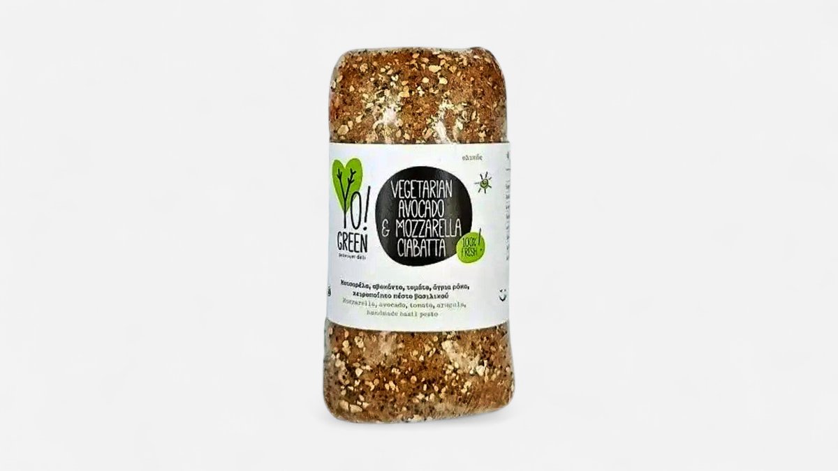 Μοτσαρέλα, αβοκάντο, τομάτα, ρόκα, χειροποίητο πέστο βασιλικού ( Ciabatta ολικής άλεσης )