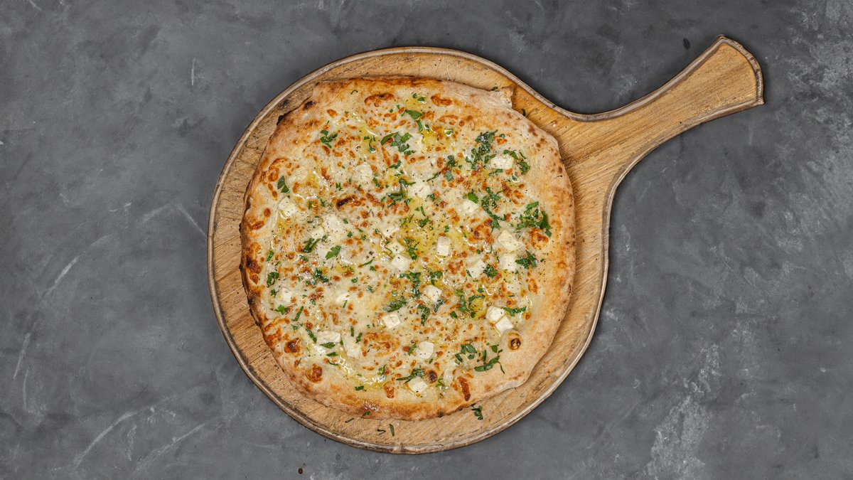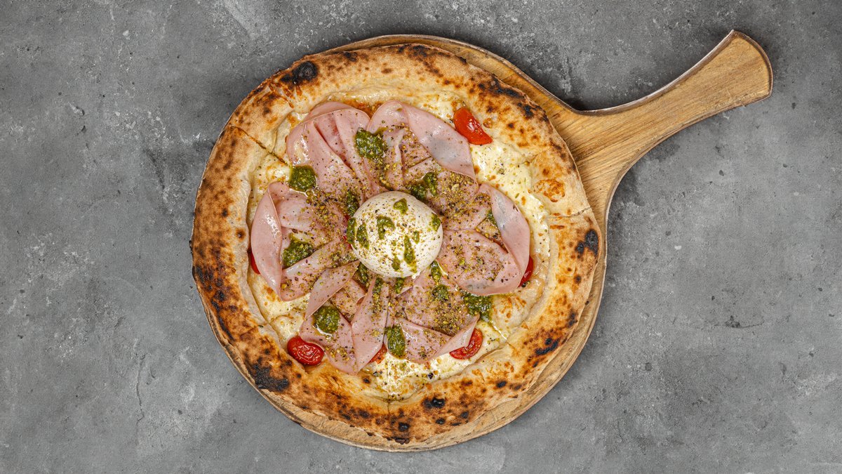 32cm. Με mozzarella fior di latte, κρέμα pecorino, prosciutto cotto και πατάτα flocco