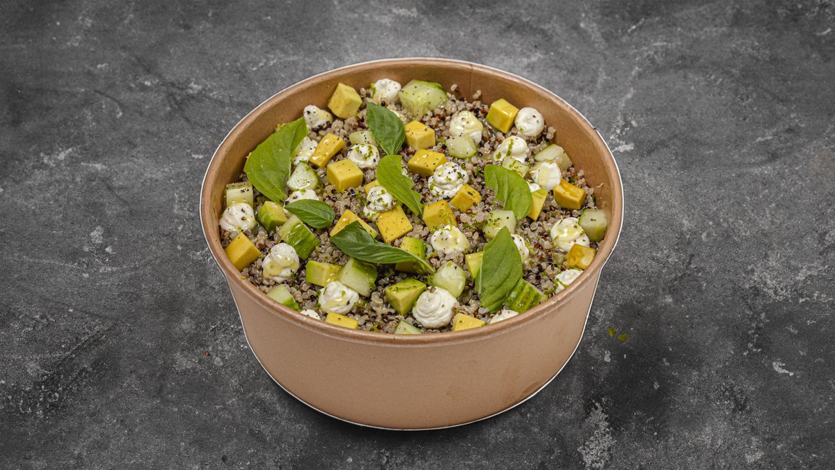 Σαλάτα με baby σπανάκι, baby ρόκα, λολα, avocado, κινόα, dressing εσπεριδοειδών, κρέμα ricotta & αγγούρι