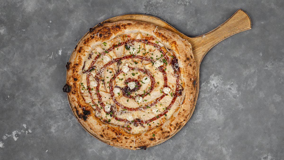 Με σάλτσα bbq, mozzarella, provolone, κοτόπουλο φιλέτο, καραμελωμένο κρεμμύδι και θυμάρι