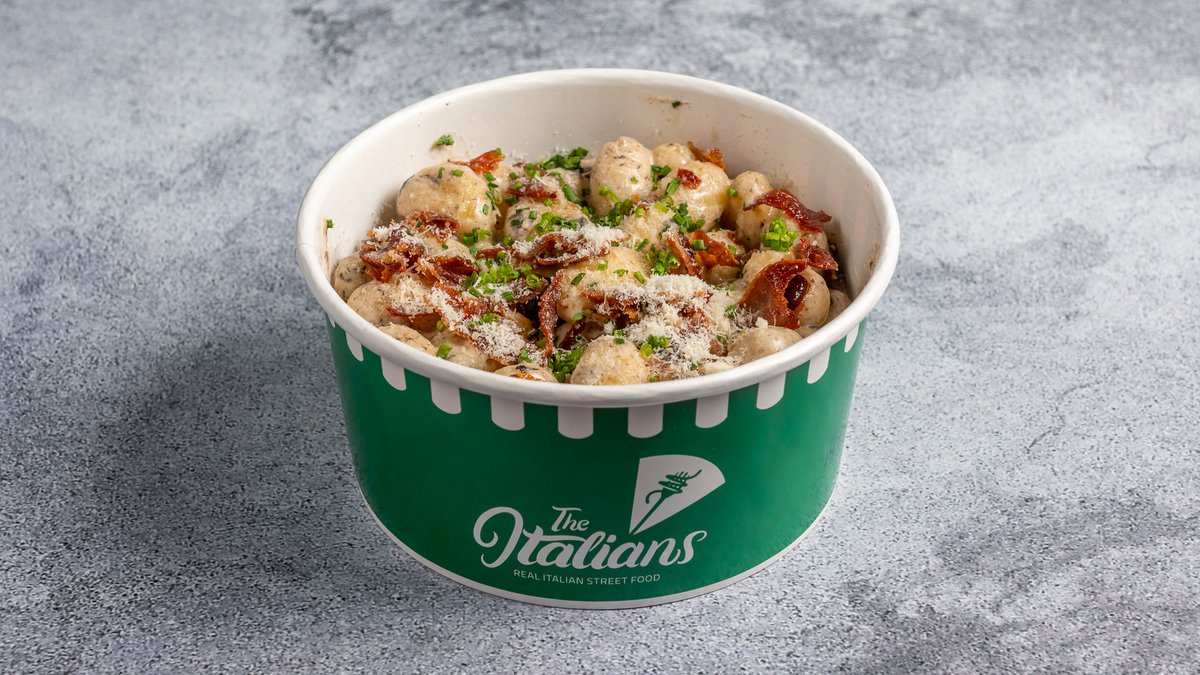 Χειροποίητα gnocchi με κρέμα παρμεζάνα, πάστα μαύρης τρούφας και crispy prosciutto Parma