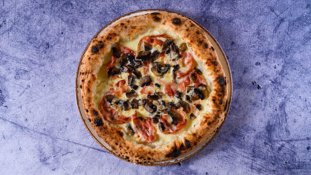 32cm. Με mozzarella, καπνιστή πανσέτα, mix μανιταριών, κρέμα γάλακτος, provolone και λάδι τρούδας