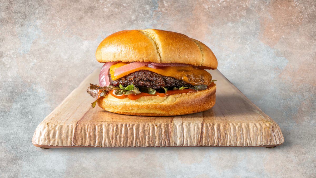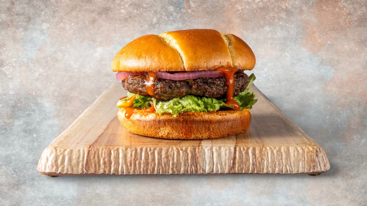Με potato bun, μπιφτέκι plantbased, πίκλα κρεμμύδι, salad mix και house bbq