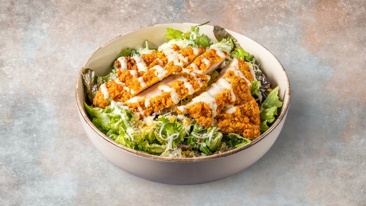 Με salad mix, τραγανό κοτόπουλο σε κρούστα, καλαμπόκι, παρμεζάνα και spooners caesars sauce