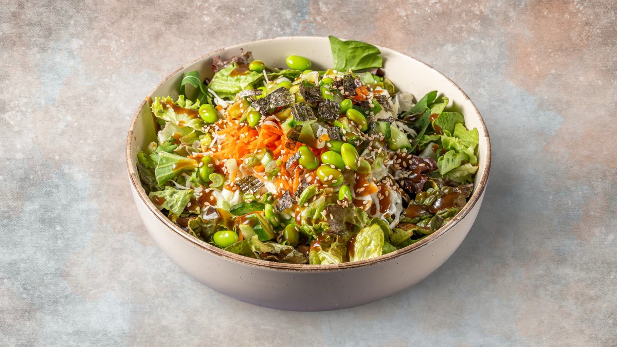 Με salad mix, λάχανο, καρότο, φρ.κρεμμύδι, αγγούρι, edamame, σουσάμι, wakame και spooners asian sauce