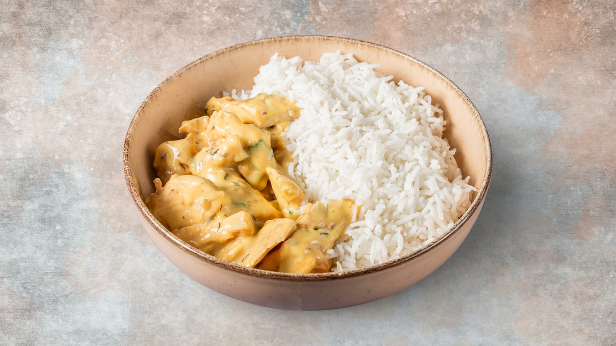 Με φιλέτο κοτόπουλο. Συνοδεύεται από πλούσια σως μουστάρδας dijon και ρύζι basmati ατμού