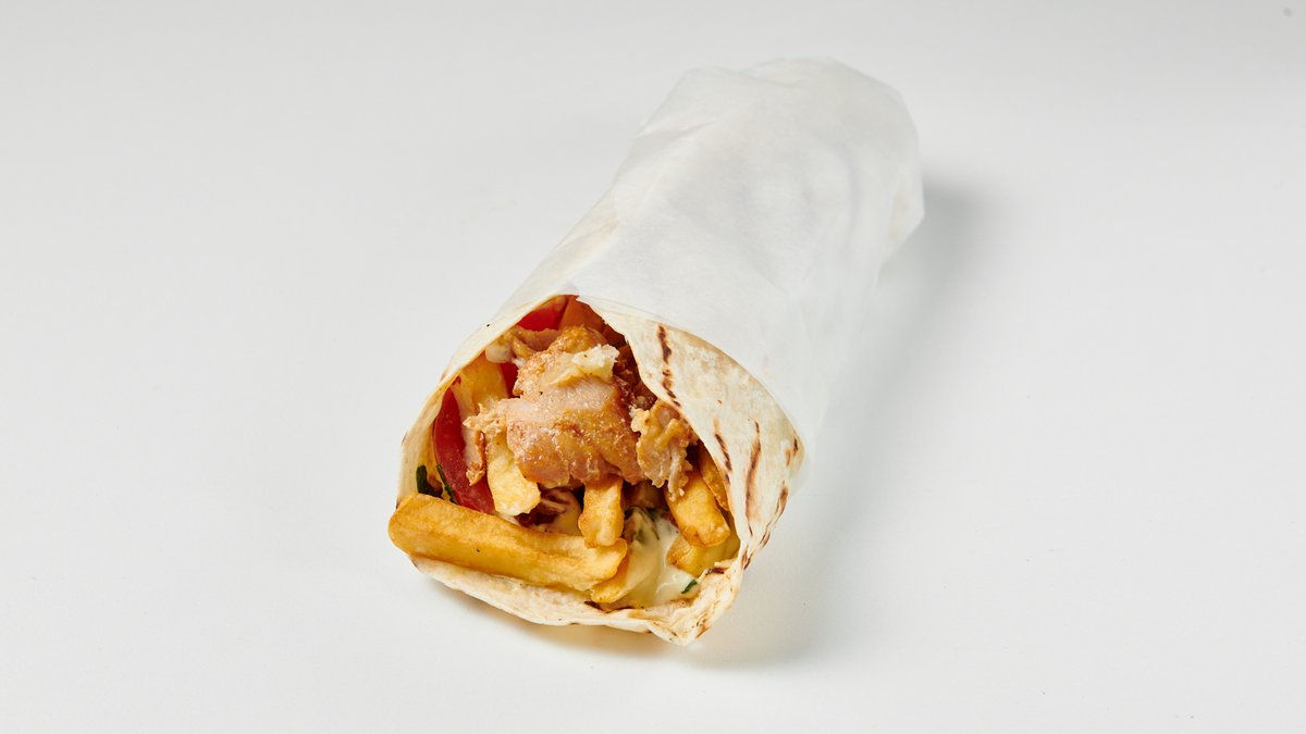 Με γύρο κοτόπουλο, gouda, μπέικον, μαρούλι, ντομάτα και μαγιονέζα. Συνοδεύεται από πατάτες τηγανητές