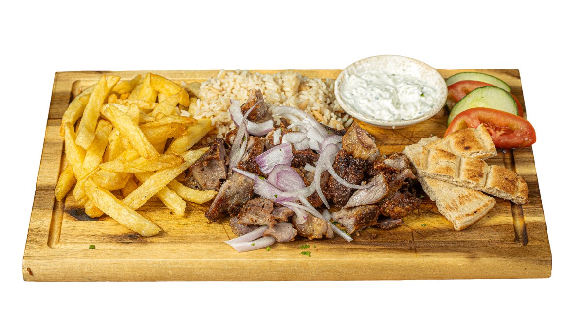 Συνοδεύεται από ντομάτα, κρεμμύδι, πατάτες τηγανητές, τζατζίκι και 1 πίτα