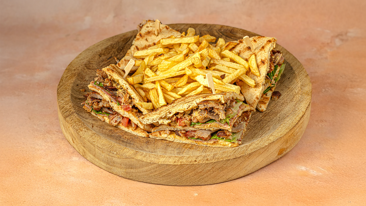 Συνοδεύεται από ντομάτα, κρεμμύδι, πατάτες τηγανητές, σως κίτρινη και 1 πίτα