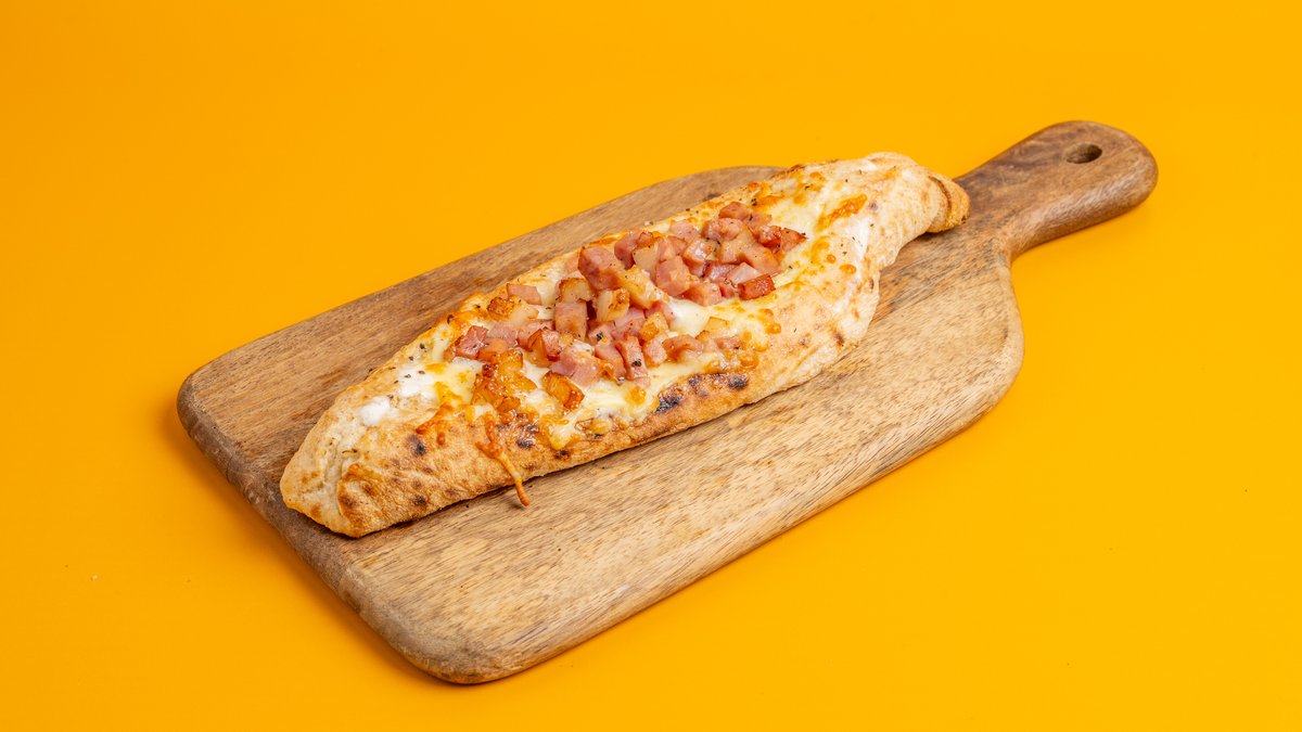 18 -20cm. Καρβέλι προζυμένιο αργής ωρίμανσης με μπριζόλα καπνιστή, σαλάμι αέρος και mix τυριών (mozzarella, regato και emmental)