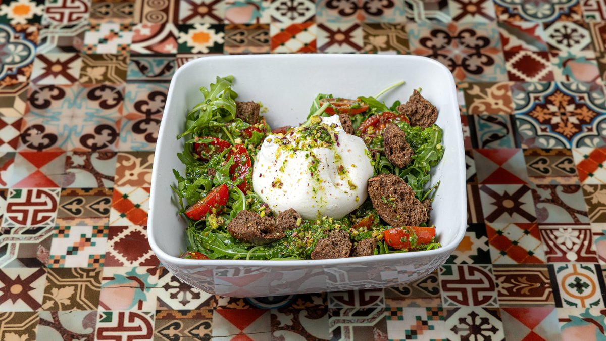 Με burrata 125gr, ρόκα, ντοματίνια, pesto βασιλικού, παξιμάδι χαρουπιού, φιστίκι Αιγίνης