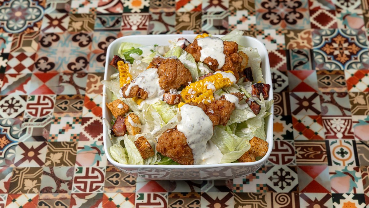 Με κοτόπουλο στήθος παναρισμένο, iceberg, παρμεζάνα, μπέικον, καλαμπόκι, κρουτόν σκόρδου και χειροποίητη Caesar's sauce
