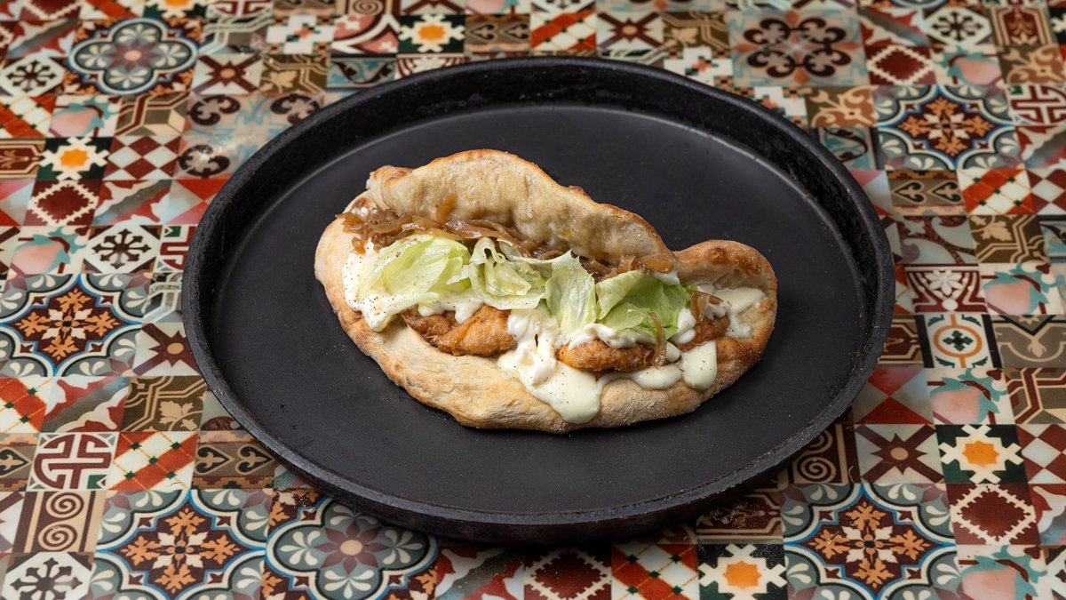 Με χειροποίητο ψωμάκι, mozzarella, provolone, κοτόπουλο στήθος παναρισμένο, καραμελωμένο κρεμμύδι, iceberg, μαγιονέζα τρούφας