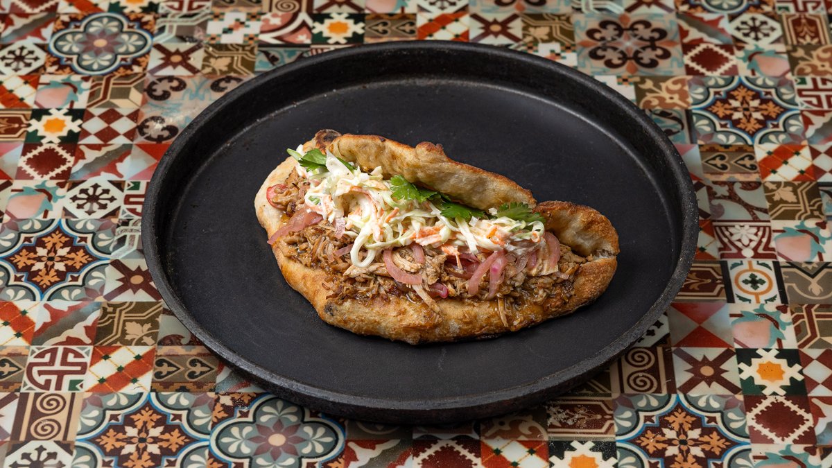 Με χειροποίητο ψωμάκι, σιγομαγειρεμένο χοιρινό, coleslaw, πίκλα κρεμμυδιού, smoked chimichuri, φρέσκος κόλιανδρος