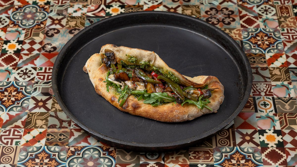 Με χειροποίητο ψωμάκι, mozzarella φρέσκια, πιπεριές, μανιτάρια, pesto βασιλικού, ρόκα, οξύμελο
