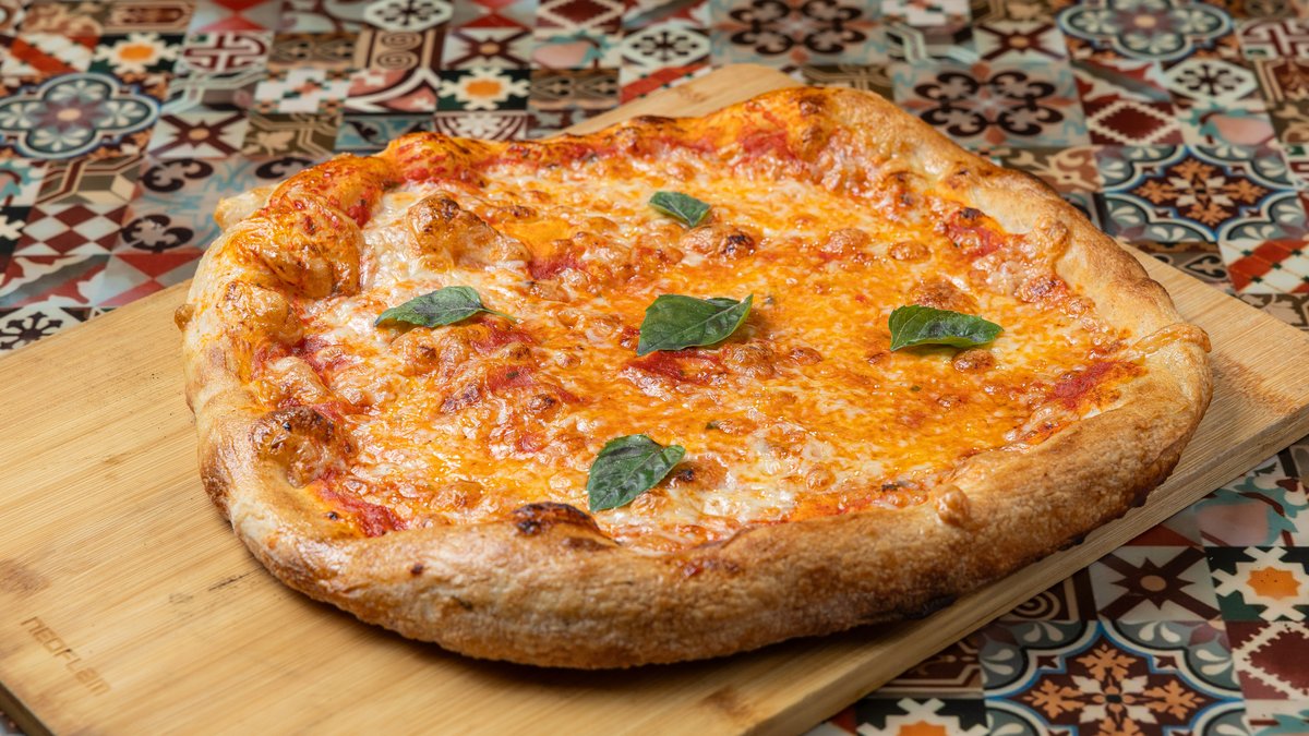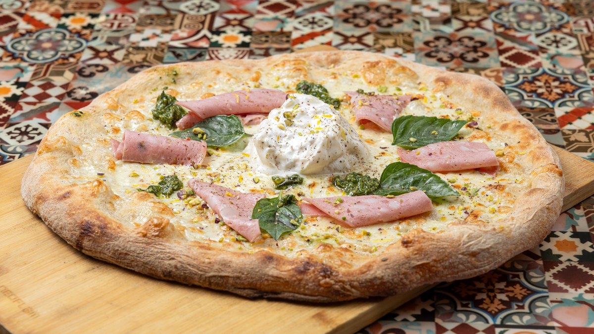 Με mozzarella, burrata 125gr, κρέμα γάλακτος, μορταδέλα, φιστίκι Αιγίνης, ξύσμα λεμονιού, pesto βασιλικού, φρεσκοτριμμένο πιπέρι
