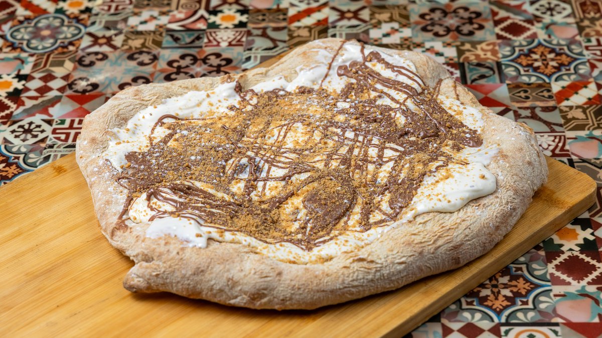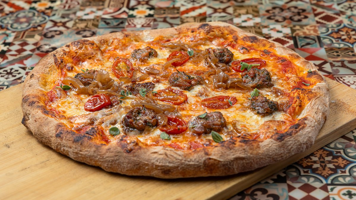 Mozzarella, provolone, σάλτσα ντομάτας, λουκάνικο προβατίνας, καραμελωμένα κρεμμύδια, ντοματίνια confit, ψημένο σκόρδο