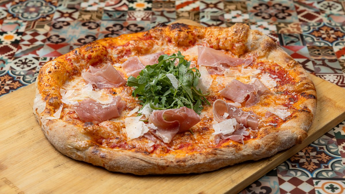 Με mozzarella, παρμεζάνα flakes, σάλτσα ντομάτας, prosciutto, ρόκα