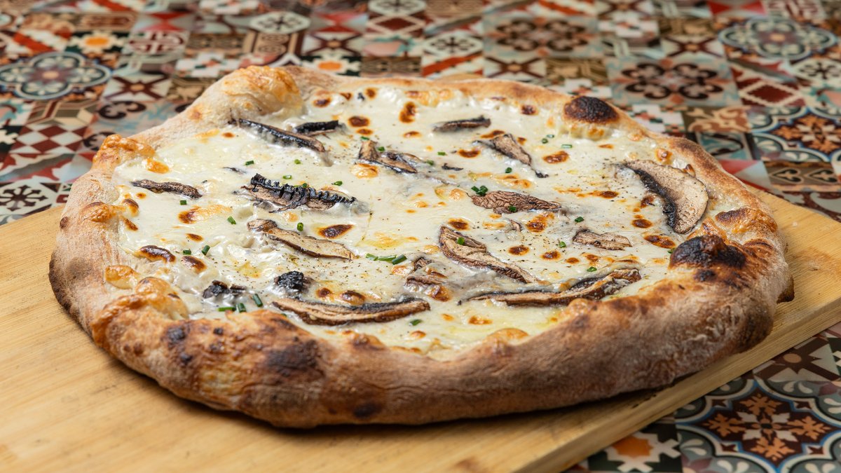 Με mozzarella, παρμεζάνα, κρέμα τυρί, μανιτάρια, ψημένο σκόρδο, λάδι τρούφας, φρεσκοτριμμένο πιπέρι