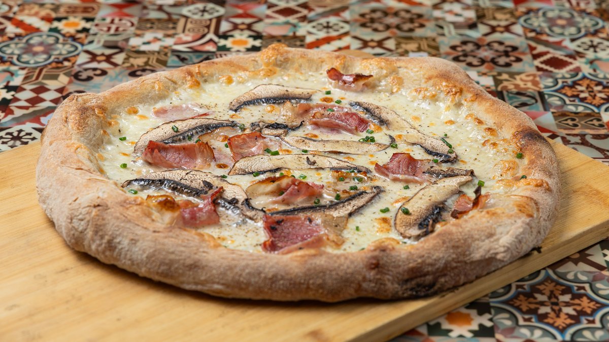 Με mozzarella, κρέμα γάλακτος, bacon, μανιτάρια, φρεσκοτριμμένο πιπέρι