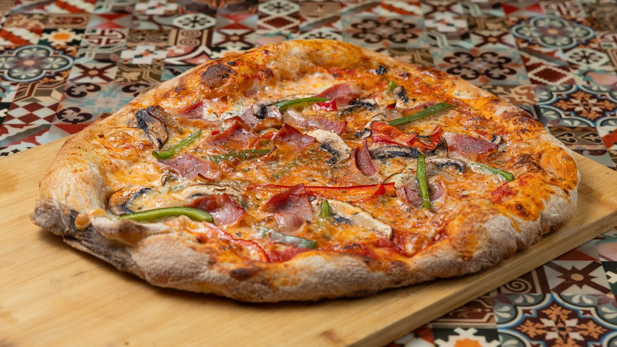 Με mozzarella, σάλτσα ντομάτας, bacon, μανιτάρια, πιπεριές