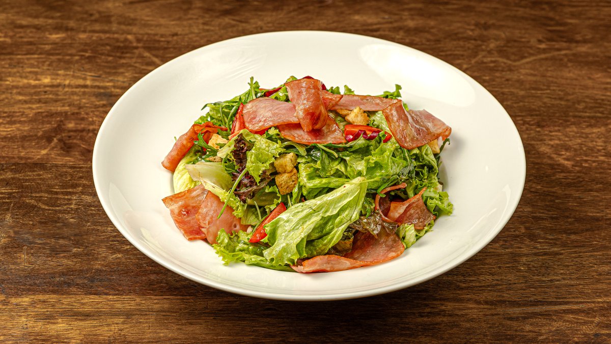 Σαλάτα με μαρούλι romaine, λόλα πράσινη, λόλα κόκκινη, κινέζικο λάχανο, κόκκινο radicchio, κρουτόν, ντοματίνια, dressing βαλσάμικο και μπέικον