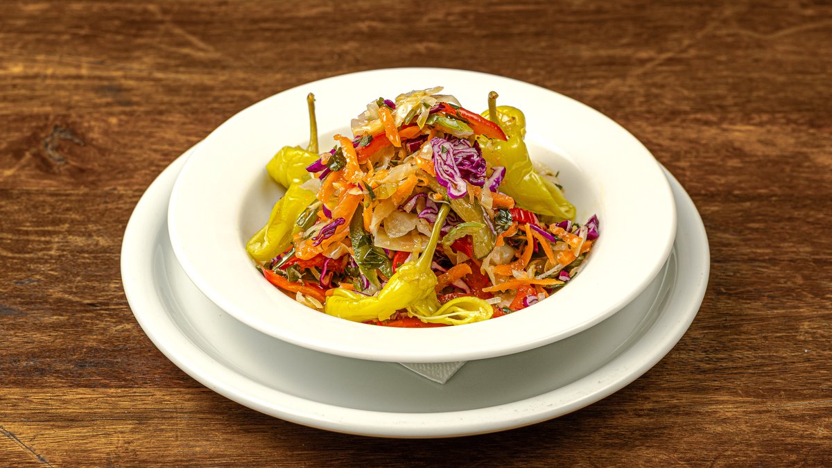 Σαλάτα με λάχανο λευκό, λάχανο κόκκινο, σέλινο, πιπεριά πράσινη, πιπεριά κόκκινη, καρότο, κάππαρη και αγγουράκι τουρσί