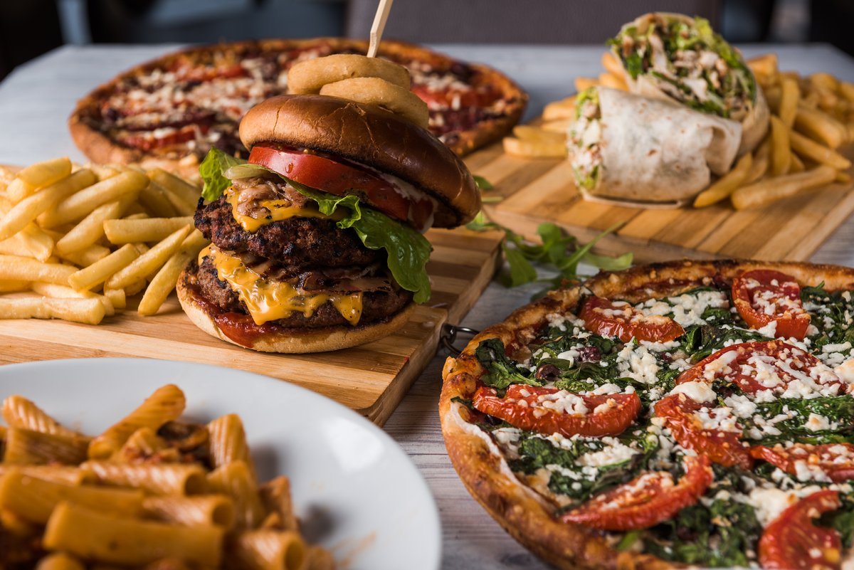 Με διπλό μπιφτέκι, διπλό τσένταρ, μπέικον, κρεμμύδι, μαρούλι, αγγουράκι τουρσί και ντομάτα