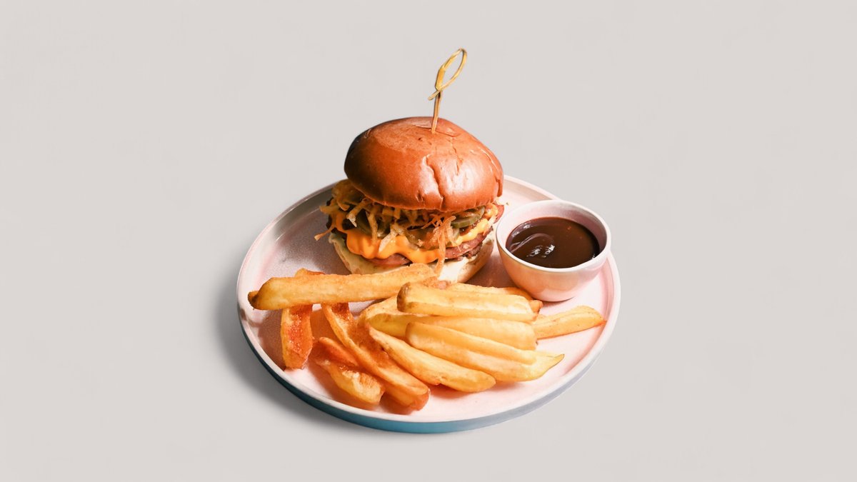 2 μπιφτέκια smash, cheddar, μπέικον, καραμελωμένα κρεμύδια,πικάντικη πίκλα, σως toucan και chips πατάτας. Συνοδεύεται από τηγανητές πατάτες και σως ή σαλάτα