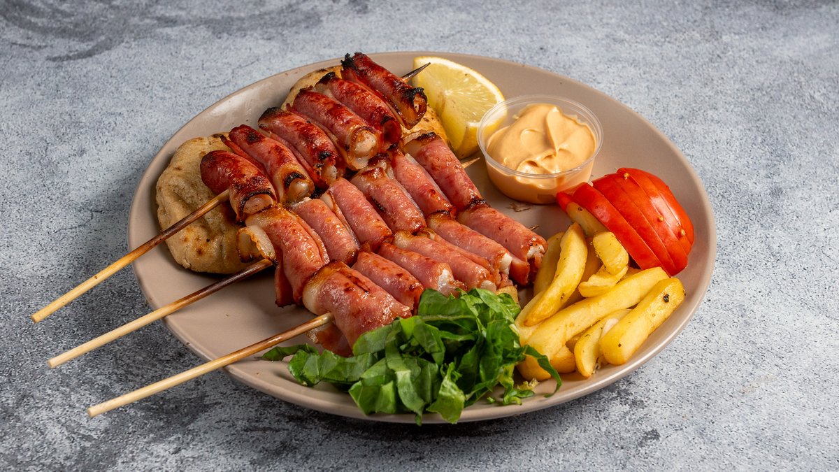 Για 2 άτομα. Με 250g κοντοσούβλι χοιρινό, 250g κοντοσούβλι κοτόπουλο, 1 καλαμάκια χοιρινά, 1 καλαμάκια κοτόπουλο, 1 κεμπάπ και 1 λουκάνικα χωριάτικα. Συνοδεύεται από πατάτες τηγανητές, 2 πίτες, ντομάτα, μαρούλι, κρεμμύδι, 1 τυροκαυτερή 0.18 l και 1 τζατζίκι 0.18 l
