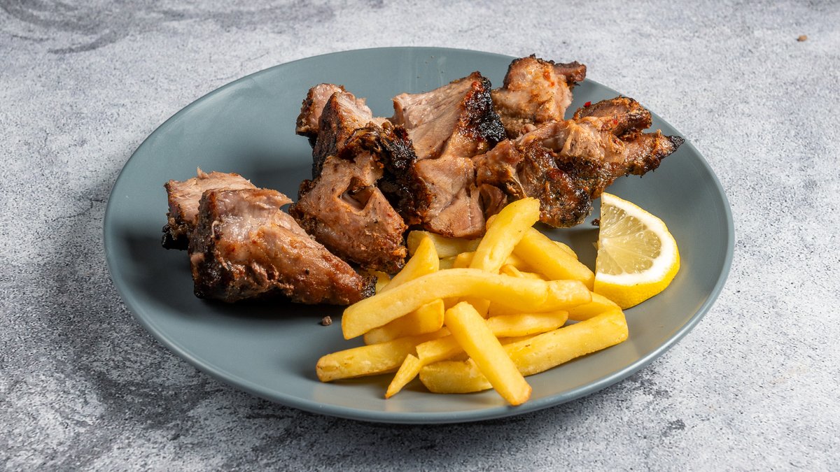 300g. Συνοδεύεται από πατάτες τηγανητές, ντομάτα, κρεμμύδι, 2 πιτάκια και sauce ή τζατζίκι ή τυροκαυτερή