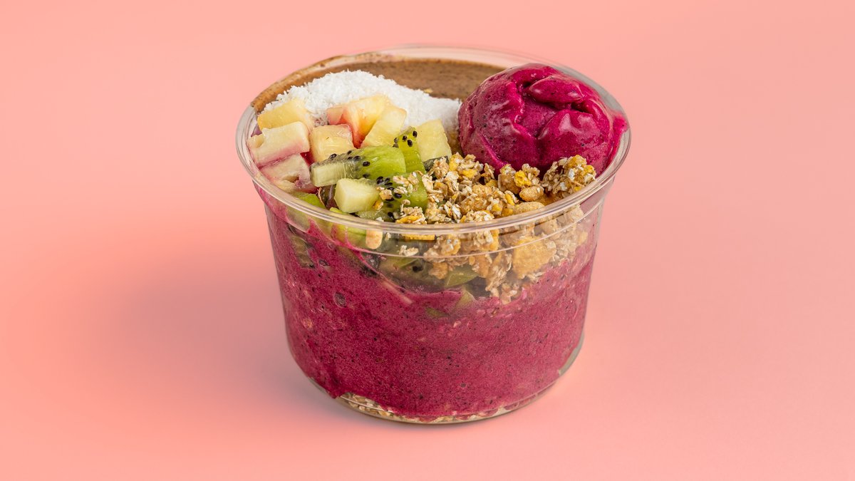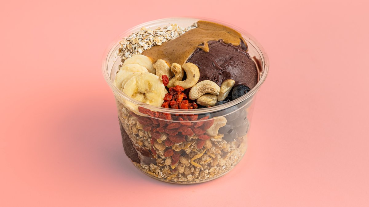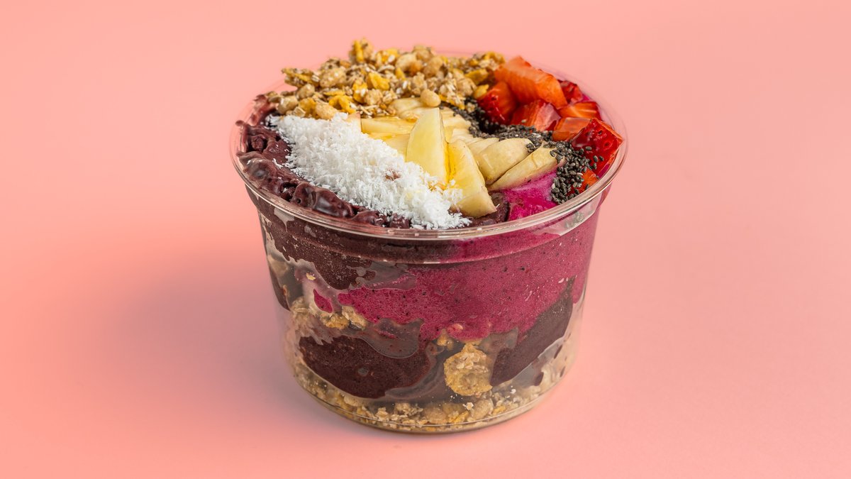 Açai, φράουλα, μπανάνα, μύρτιλλο, γκρανόλα, νιφάδες κακάο, μέλι ανθέων, φυστικοβούτυρο. Η φωτογραφία αφορά το regular μέγεθος.
