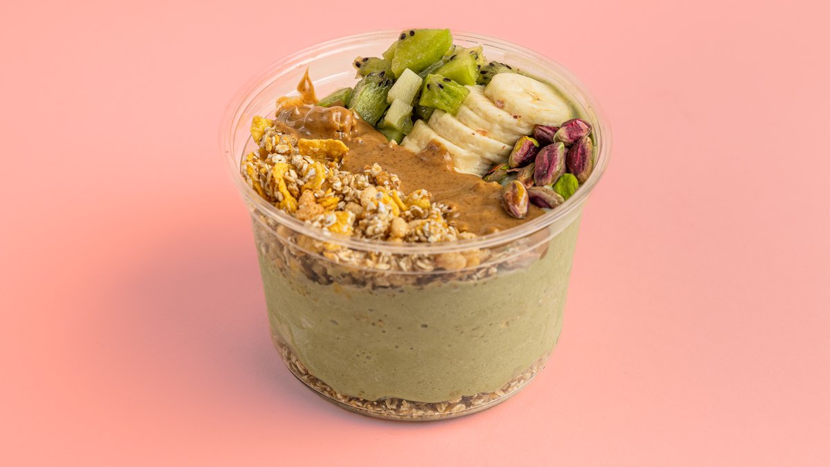 Pitaya, ανανάς, ακτινίδιο, γκρανόλα, τριμμένη καρύδα, αμυγδαλοβούτυρο. Η φωτογραφία αφορά το regular μέγεθος.