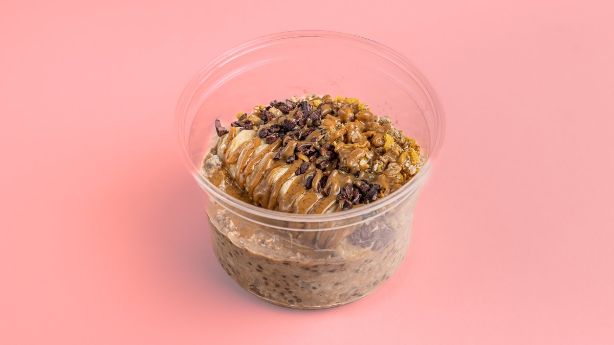 Βρώμη, σπόροι τσία, κακάο, τριμμένη καρύδα, σιρόπι αγαύης, γάλα βρώμης, μπανάνα, γκρανόλα, νιφάδες κακάο, φυστικοβούτυρο