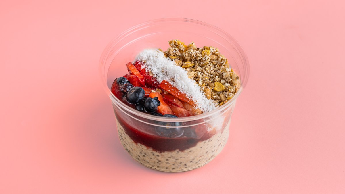 Βρώμη, σπόροι τσία, τριμμένη καρύδα, σιρόπι αγαύης, γάλα βρώμης, φράουλα, μύρτιλλα, γκρανόλα, τριμμένη καρύδα, μαρμελάδα φράουλα χωρίς ζάχαρη