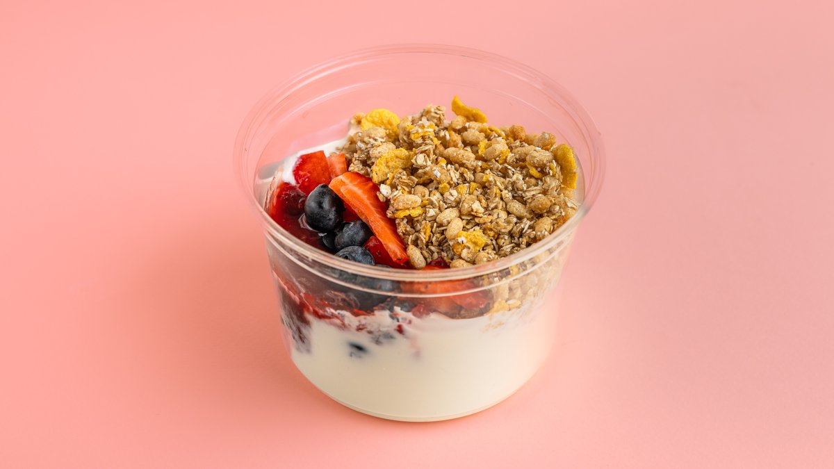 Γιαούρτι 2 %, φράουλα, μύρτιλλα, γκρανόλα, μαρμελάδα φράουλα χωρίς ζάχαρη, μέλι ανθέων