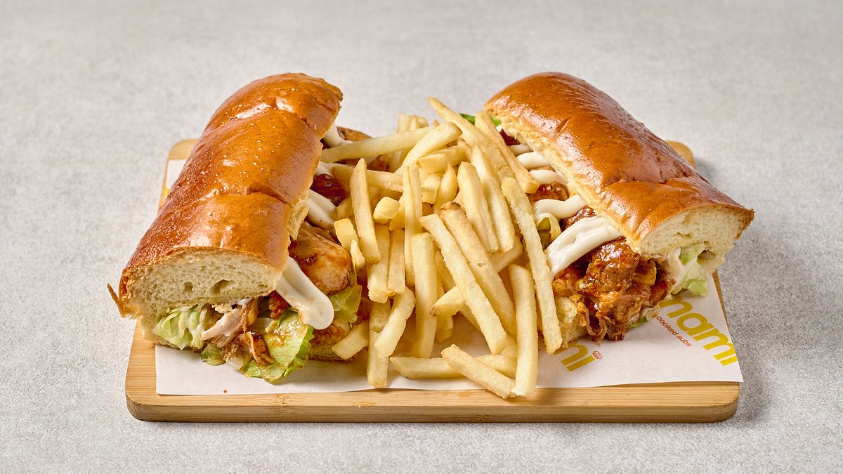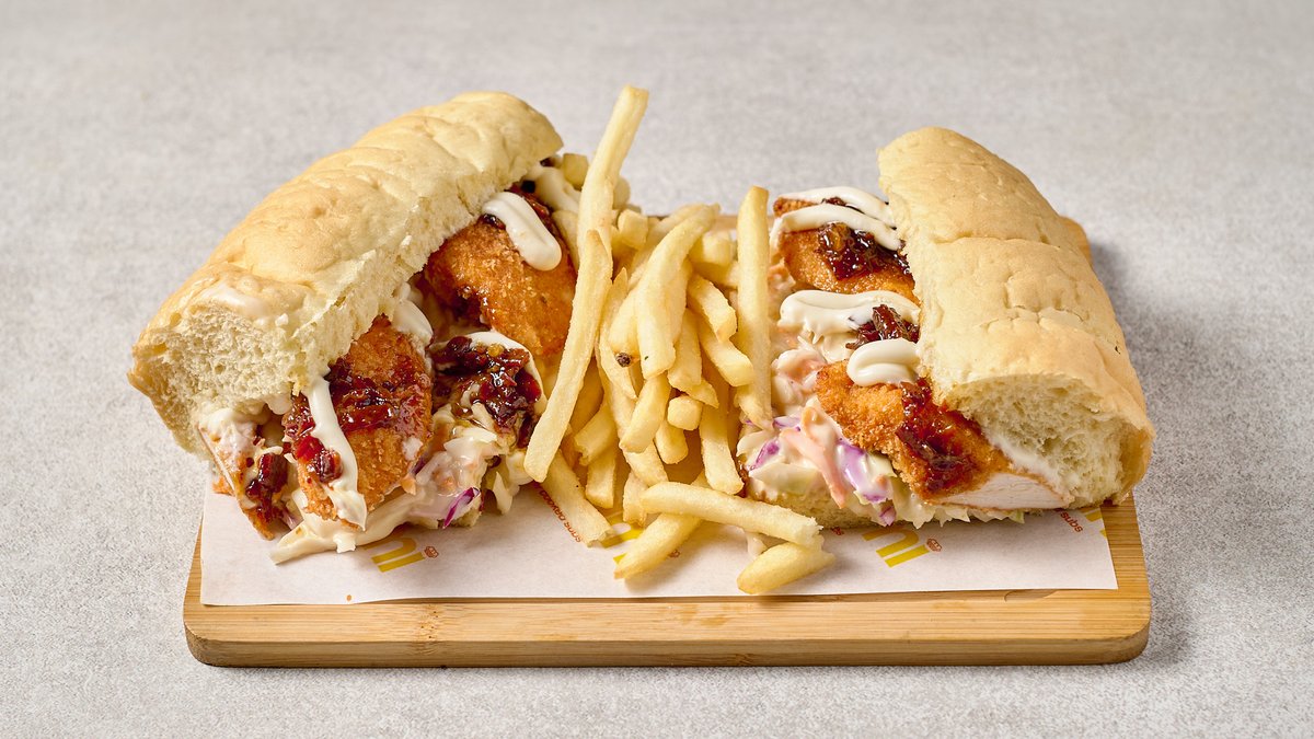 Από φιλέτο κοτόπουλο μαριναρισμένο για 6 ώρες σε ψωμάκι ατμού, μαρμελάδα, μπέικον, coleslaw, garlic mayo και τηγανητές πατάτες