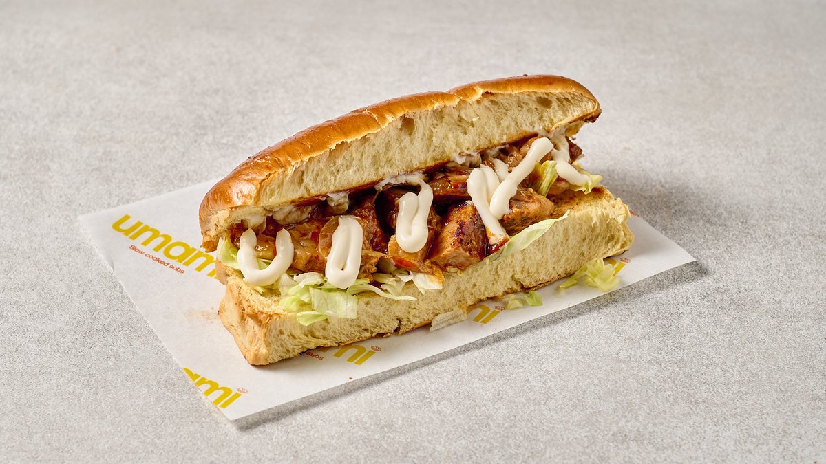 Aπό φιλέτο κοτόπουλο μαριναρισμένο για 6 ώρες σε ψωμάκι ατμού , glaze sriracha-honey , ροδέλες αγγουριού , iceberg,mayo