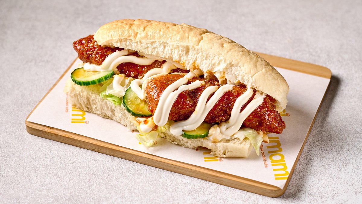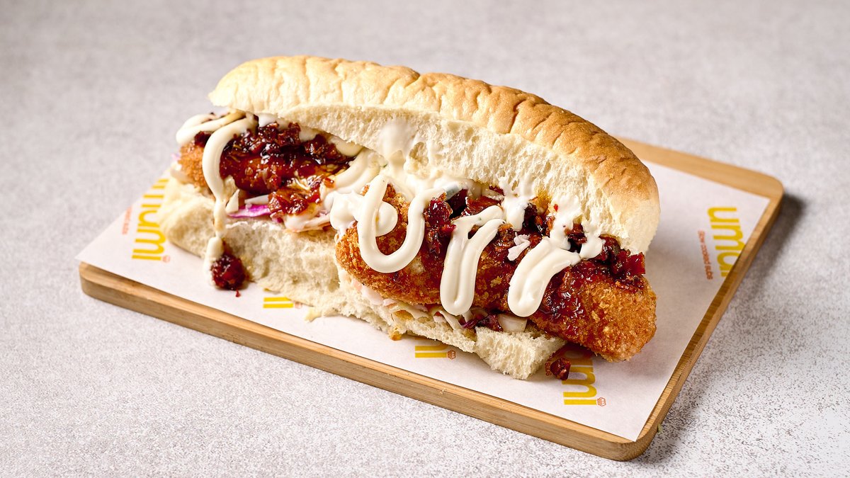 Από φιλέτο κοτόπουλο μαριναρισμένο για 6 ώρες σε ψωμάκι ατμού, μαρμελάδα, μπέικον, coleslaw και garlic mayo