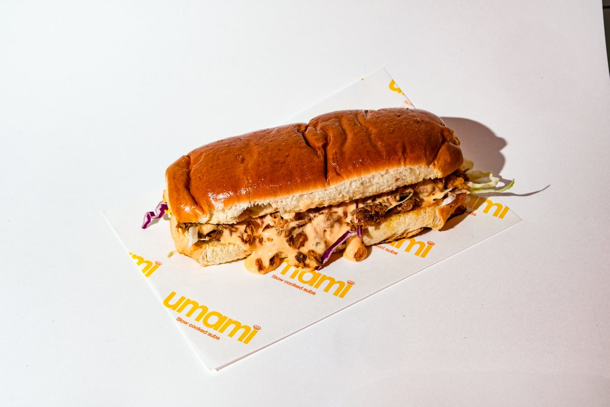 Μαδημένο χοιρινό σιγομαγειρεμένο για 10 ώρες,ανάμεσα σε brioche σκορδοβούτυρου, cheddar sauce,τηγανητό κρεμμύδι,λευκό και κόκκινο λάχανο