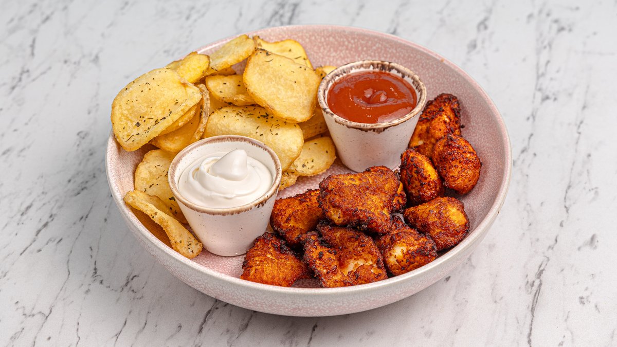 10 Τεμάχια. Συνοδεύονται από πατάτες crunch petals, ketchup και honey mustard sauce