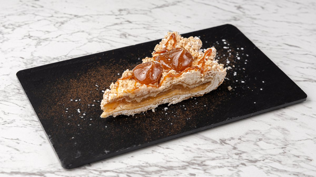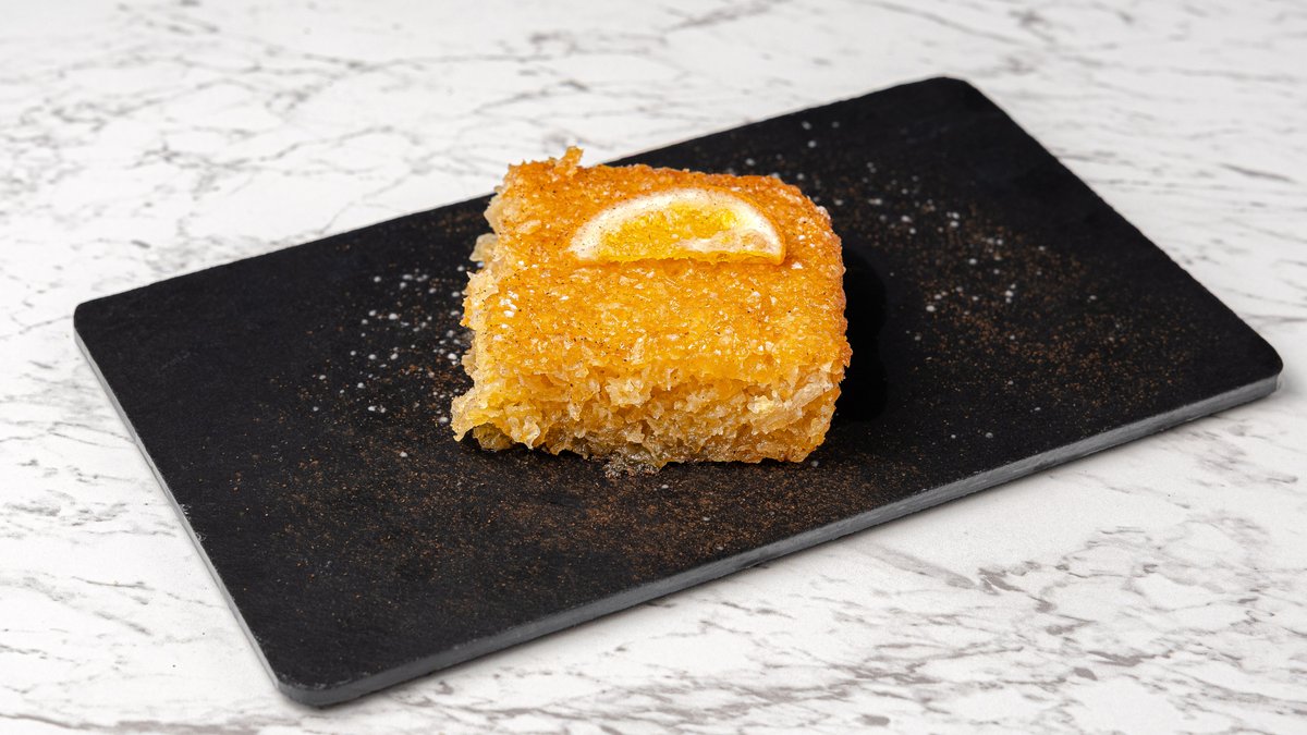 Αφράτο cake σιροπιασµένο µε φρέσκο χυµό πορτοκάλι, φύλλα κρούστα, ελληνικό στραγγιστό γιαούρτι και ξύσµα πορτοκαλιού