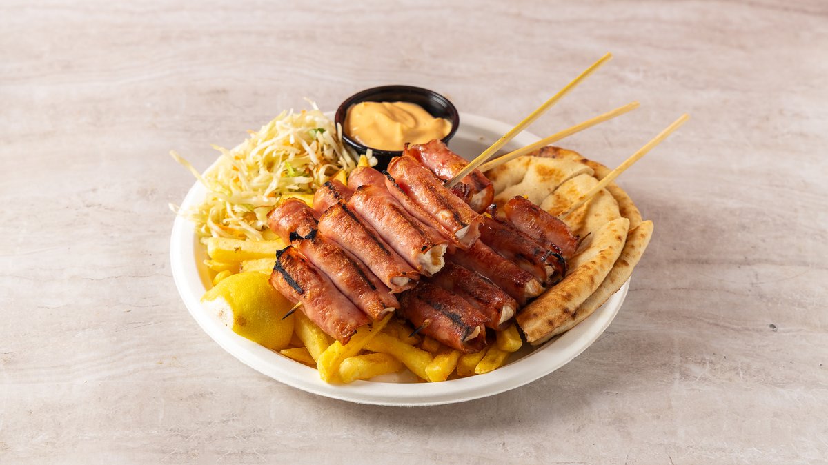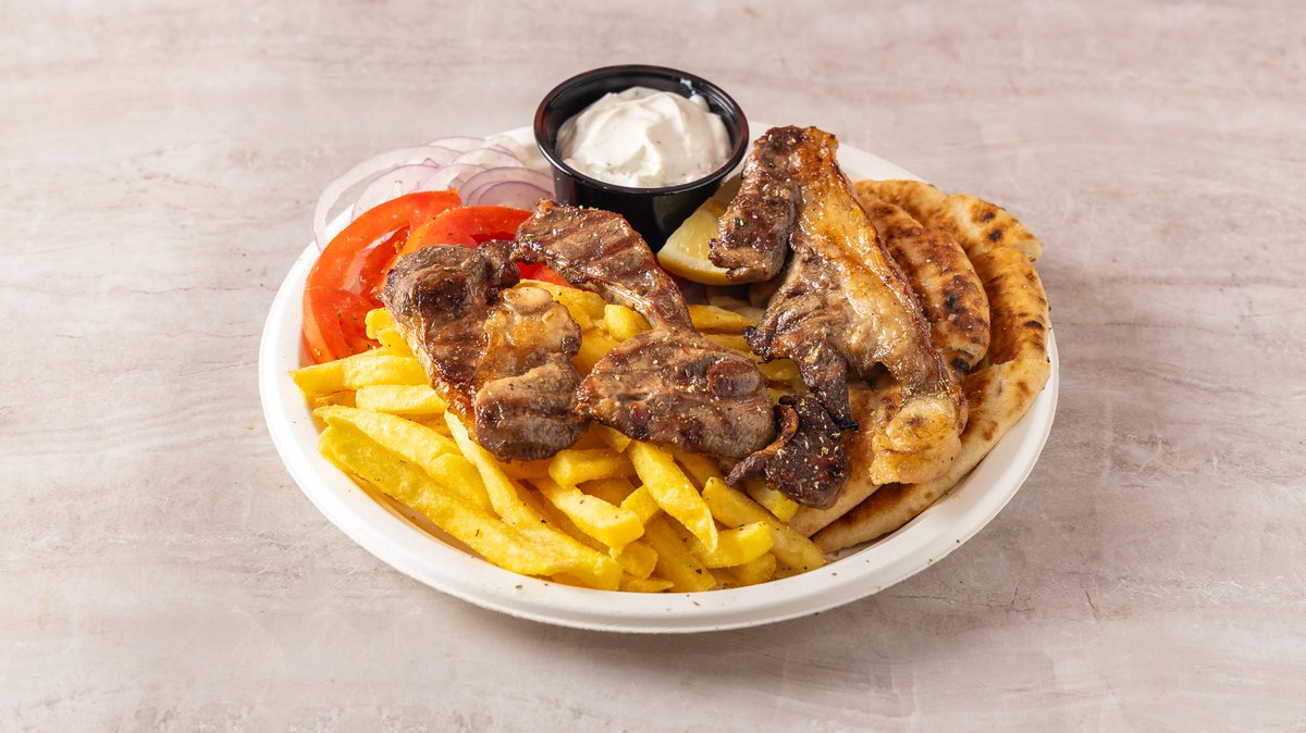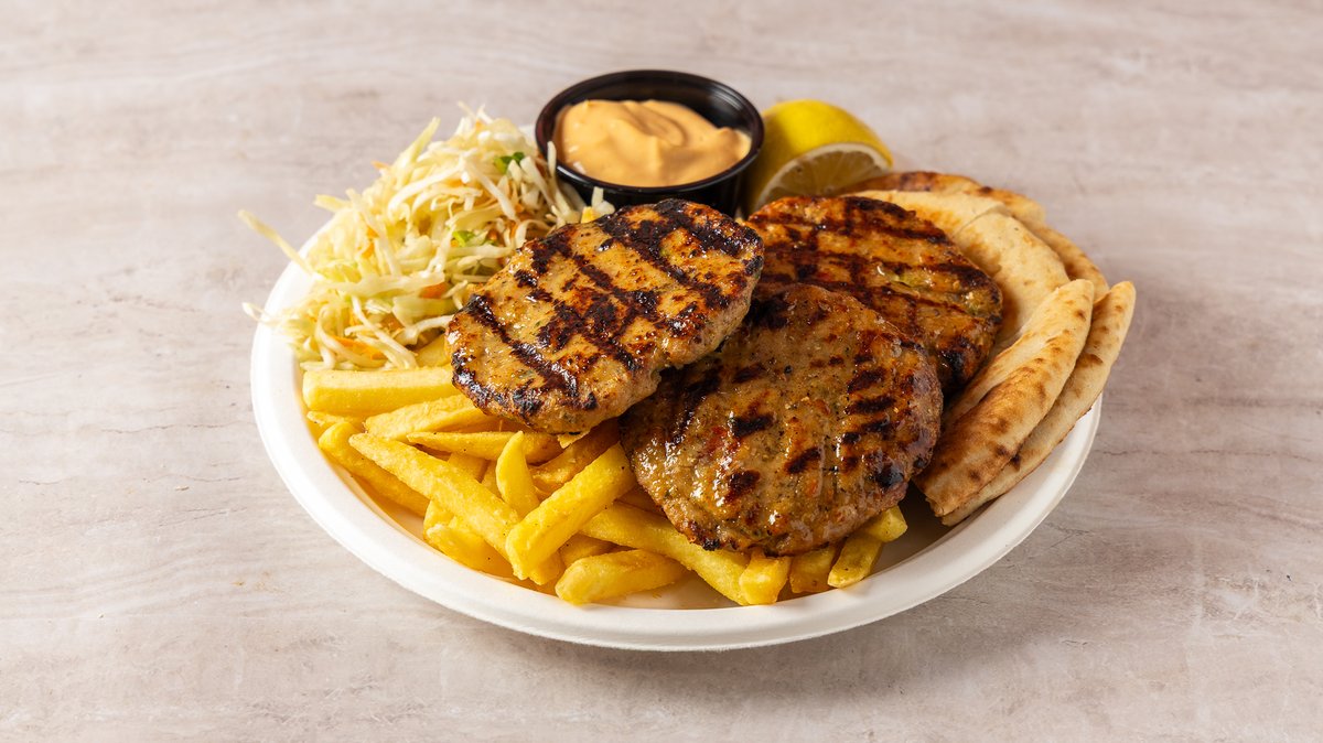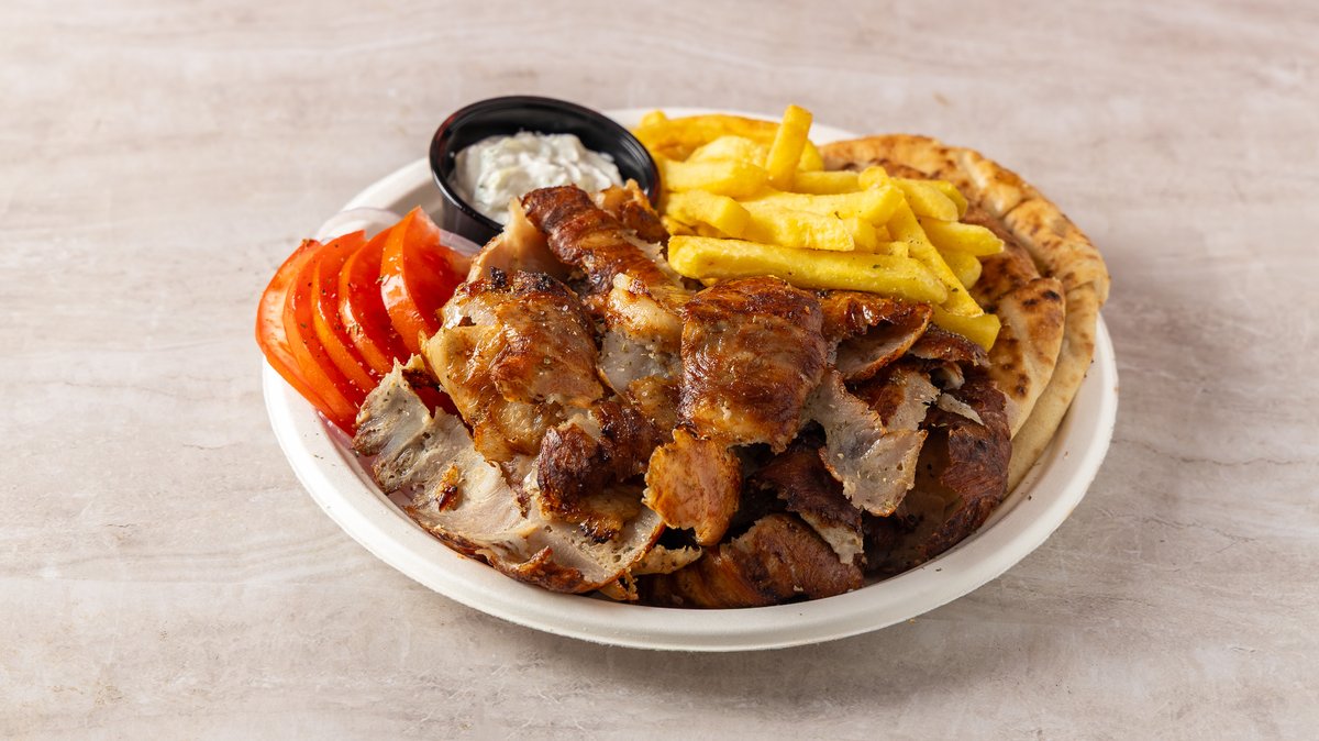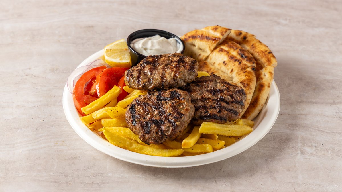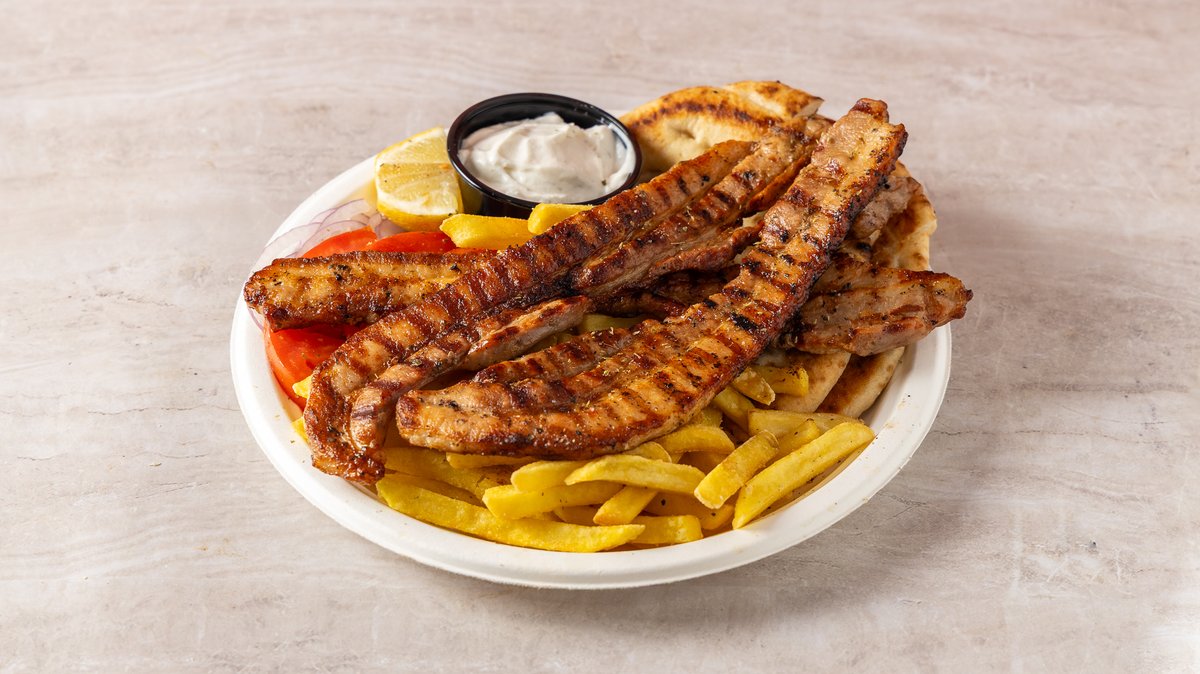Συνοδεύεται από πατάτες τηγανητές, πίτα, ντομάτα, κρεμμύδι και σως της επιλογής σου