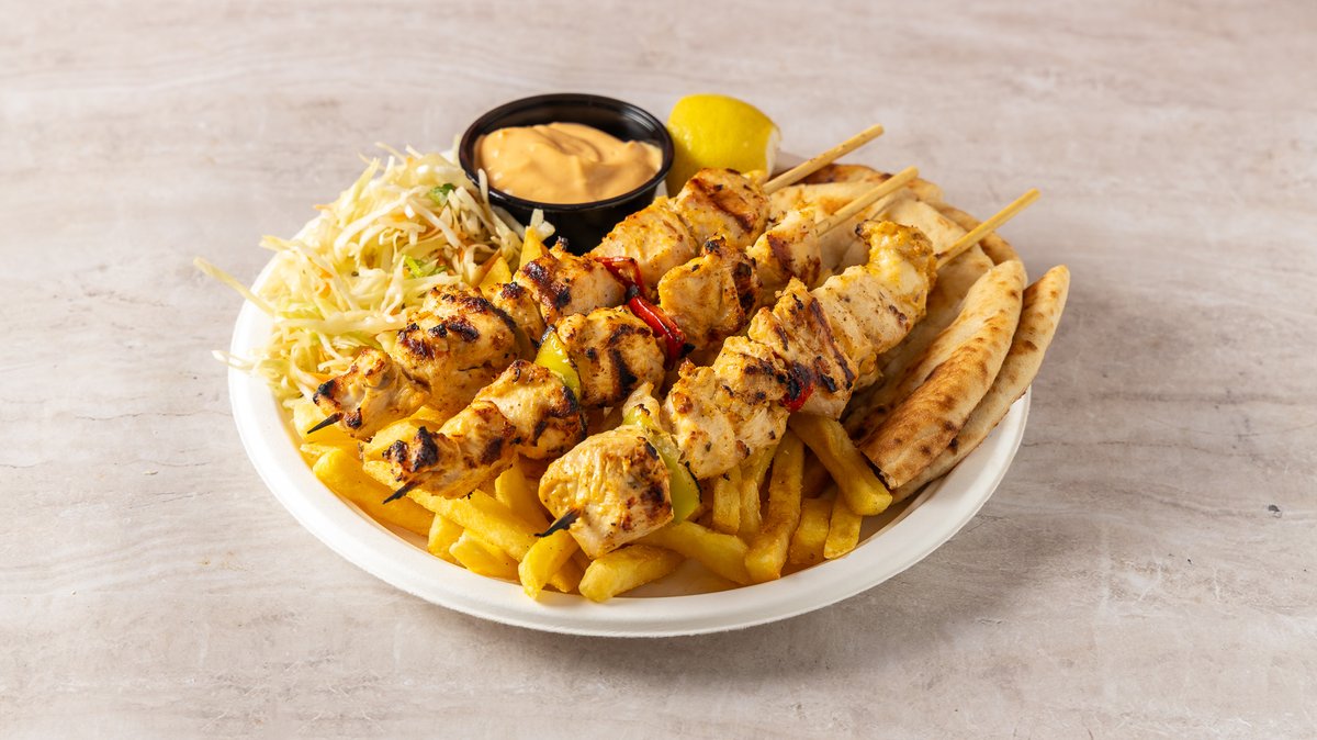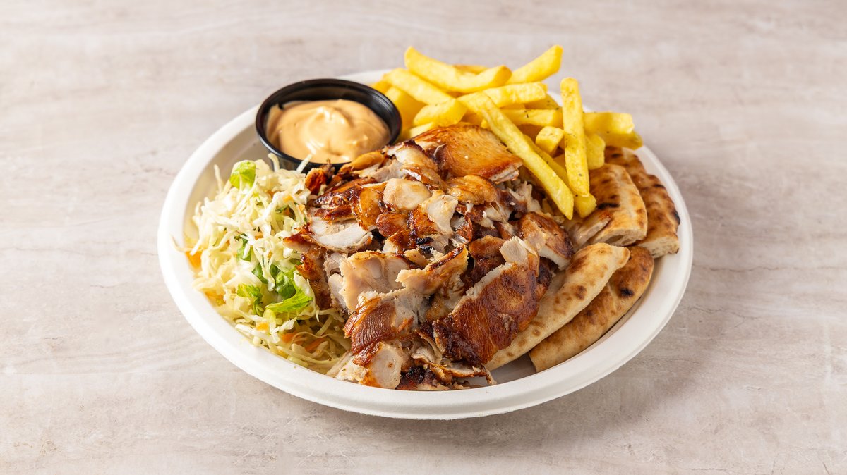 Σκεπαστή με γύρο κοτόπουλο, gouda, ντομάτα, κρεμμύδι, πατάτες και σως βεάκη. Συνοδεύεται από πατάτες τηγανητές