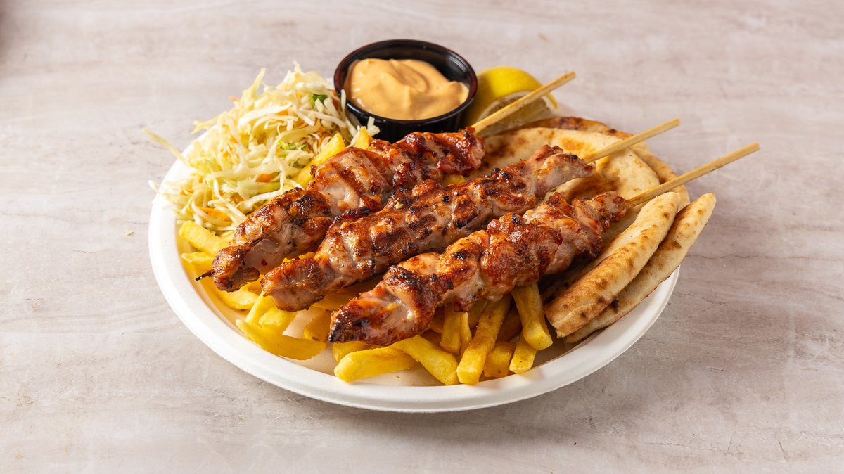 Συνοδεύεται από πατάτες τηγανητές , πίτα, σαλάτα εποχής και σως της επιλογής σου